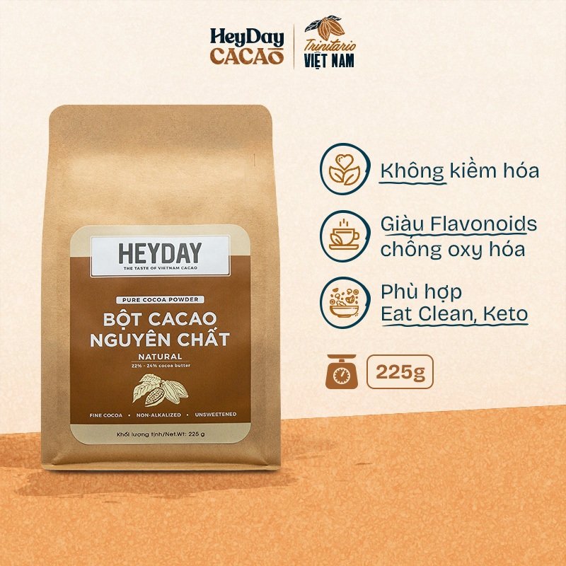 Bột cacao nguyên chất 100% không đưuờng – Dòng Natural thuần tự nhiên, không kiềm hoá – Túi giấy 225g – Heyday